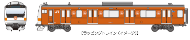 現在中央線で運行しているE233系車両に「中央線=オレンジの電車」として馴染み深い201系車両を モチーフにしたラッピングを施し運行します。先頭には記念ロゴマークをヘッドマークとして取り付けます。