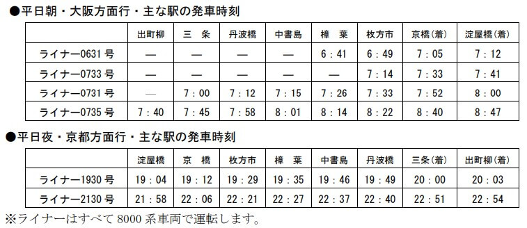 平日朝の通勤・通学時間帯に三条発淀屋橋行の全車両座席指定「ライナー」列車を1本増発します。既存の出町柳、樟葉、枚方市発のライナーと合わせ4本の運転となり、座席指定サービスを拡大します。