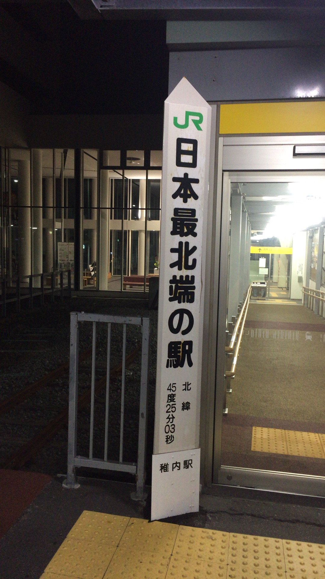 本来であれば日付が変わる前に稚内駅に着くはずだったのですが、対向列車の遅れの影響でこちらにも遅れが生じ、稚内駅に着いたのは0時過ぎでした。