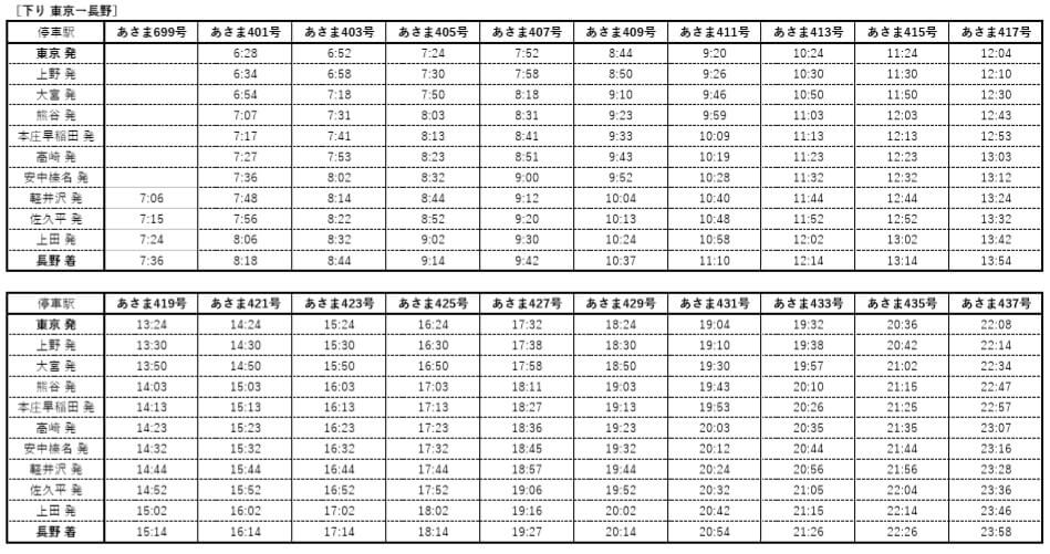 JR東日本は当面の間東京~長野間で折り返し運転を行います、なお、暫定ダイヤで設定される「あさま」・「たにがわ」については普通車全車自由席で運行します。また、グランクラスはシートのみの営業となります。