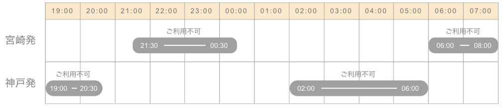 - 神戸19:00発(金・土発は19:50)→大分翌6:20着(金・土発は翌7:20着)