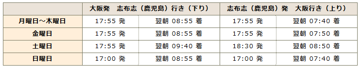 - 別府18:45発(金・土は19:35発)→大阪翌6:45着(金・土発は翌7:35)