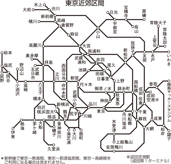 東京近郊区間は上図の通りです。かなり広い範囲で乗車できます。