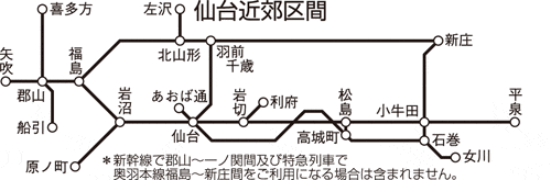 仙台近郊区間は上図の通りです。ただし、注意点として奥羽本線の「つばさ」・「とれいゆつばさ」は乗車不可なので注意しましょう。
