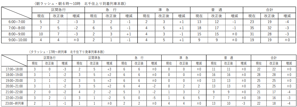 夕ラッシュ時は17時~21時の間で区間急行9本を区間準急へ格下げ、20時~21時はこれに加え急行2本を準急へ格下げします。21時以降は、区間急行と区間準急をそれぞれ4本減便し、急行7本を準急に格下げします。また、普通列車に関しては23時以降の3本を減便するほか、優等列車の格下げに伴い一部列車の区間短縮を行う模様です。