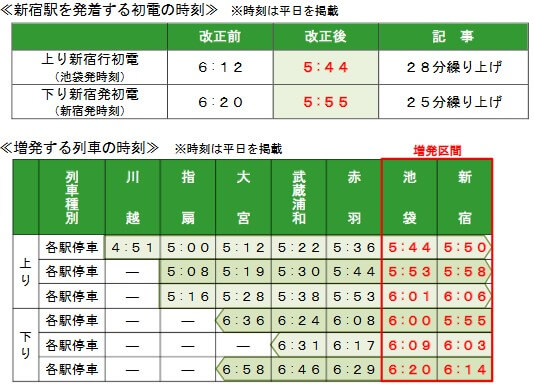 早朝帯の池袋~新宿間を3往復増発し、新宿駅を発着する初電の時刻を繰り上げます。
