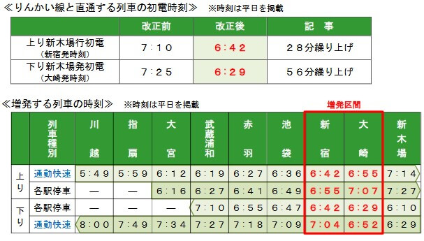 また、 朝通勤時間帯の新宿~大崎間を2往復増発し、りんかい線と直通する初電の時刻を繰り上げます。