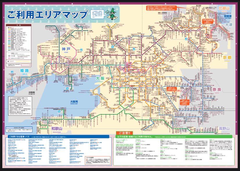 有効エリアは以下の通りです。南海電鉄、近畿日本鉄道,泉北高速鉄道、京阪電車の座席指定特急列車をご利用の場合は、別途特急券、特別車両券、座席指定券が必要です。リムジンバス・高速バス・定期観光バス・深夜急行バスは利用不可です。そのほかバスによっては利用不可の路線がありますので、利用可能路線をご確認ください。