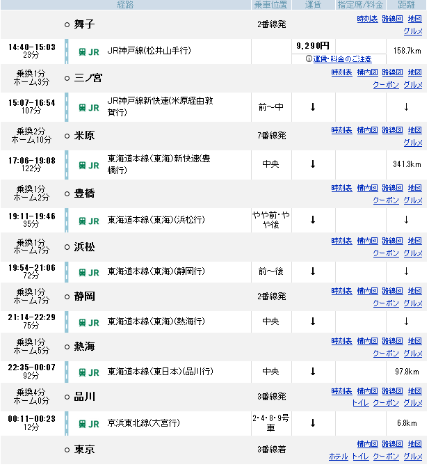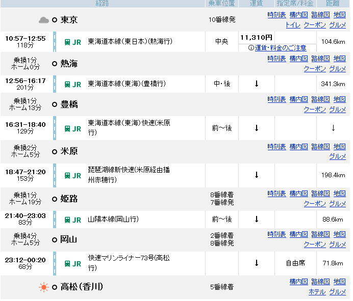 高松着の場合は大体10時ごろまでに東京駅を出発すれば高松駅に当日中に到着します。最終の乗り継ぎ時刻は以下のようになります。なんと、たった5回の乗り継ぎで高松まで行けてしまうんですね… この場合だと、昼食は事前に東京駅で購入しておき、夕食は姫路駅でとることになりそうですね。