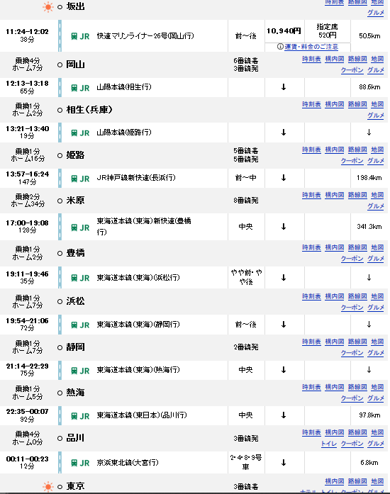 まず、坂出から東京へ向かう最終の時刻は以下の通りです。昼食は姫路駅で「えきそば」で、夕食は米原駅で購入すればどうにかなりそうですね。