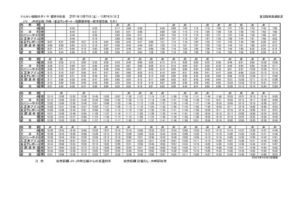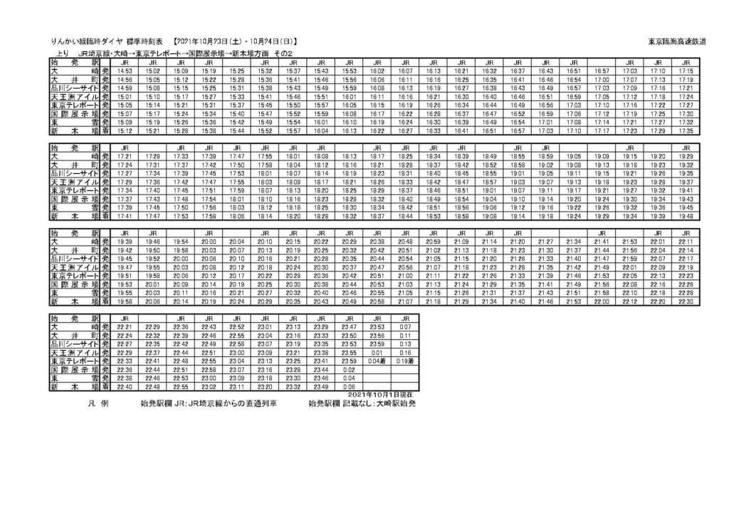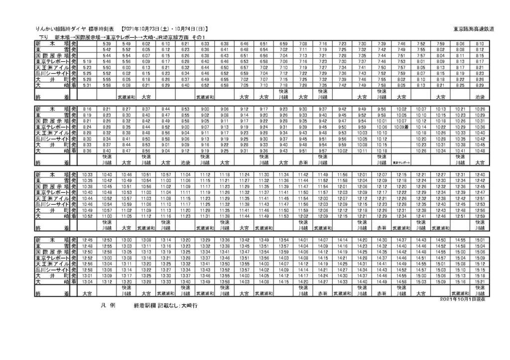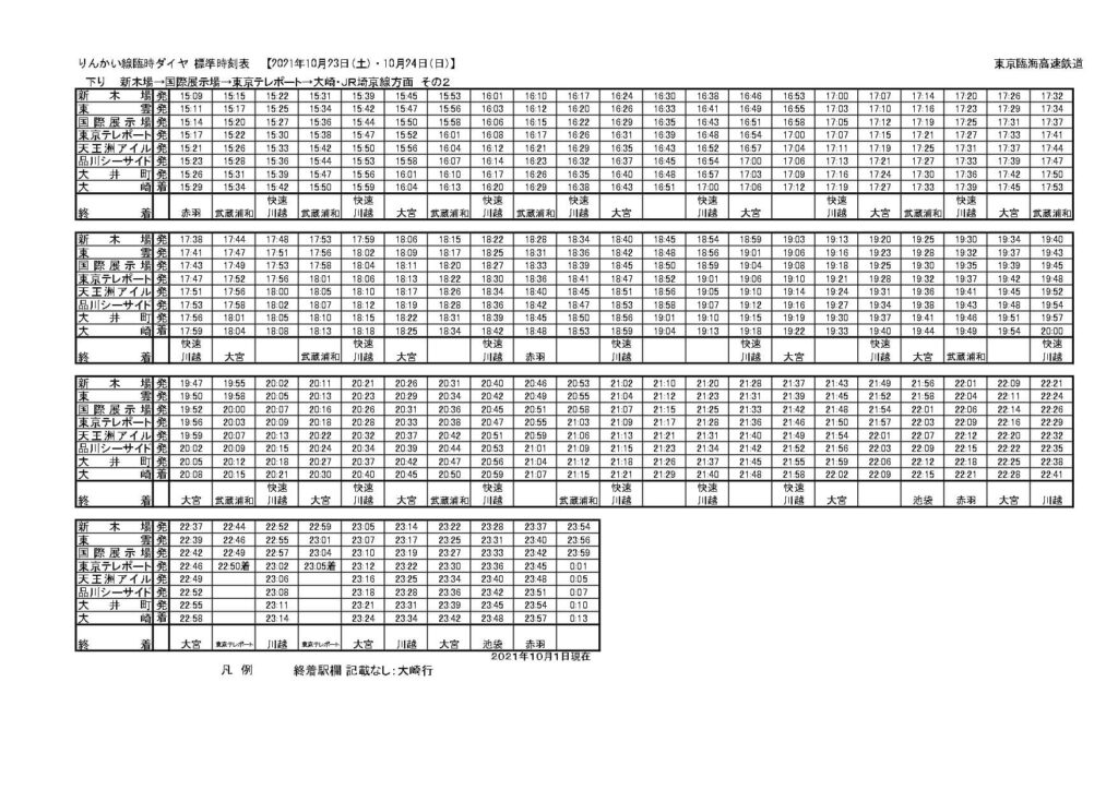 池袋~大崎間で運休する山手線内回りの本数を補うため、並行する埼京線だけではなく折り返しの都合からりんかい線も増発となっています。基本的には新宿・大崎駅で折り返していた列車をそれぞれ延長して直通運転にしたような恰好ですね。