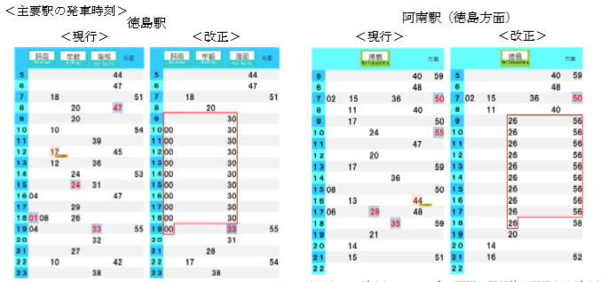 今回のダイヤ改正で牟岐線にパターンダイヤが導入される。 徳島~阿南間の9~19時台、阿南~海部間の10~15時台に運転する普通列車の運転間隔を統一し、わかりやすく利用しやすいダイヤに見直します。また、徳島~阿南駅間を運転する普 通列車を8本増発します。