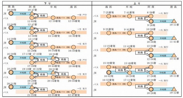 - 阿南~海部のバスはJRの代行・代替輸送ではないため、JRの”通し運賃”が適用されない。徳島~阿南はJRの運賃、阿南~海部はバスの運賃が適用されるため、 それぞれ支払いをおこなう必要がある。乗車区間にもよるが、JRの”通し運賃”よりも高額になる可能性がある。