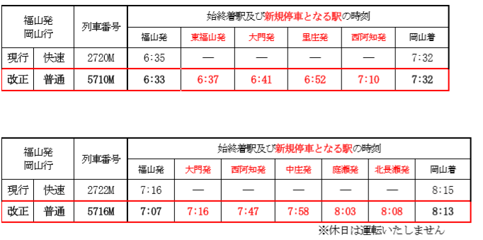朝通勤通学時間帯の福山発岡山行き快速「サンライナー」2本を各駅停車とします。