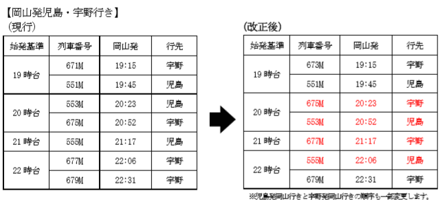 また、夜間時間帯の岡山駅から発車する普通列車の順序を変更しわかりやすいダイヤにします。