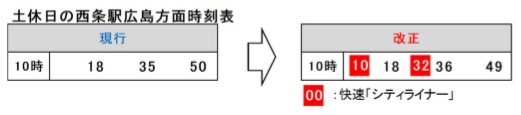 また、西条~広島間では西条駅を10時台に発車する快速「シティライナー」を2本運転します。 これにより、西条駅を10時台に発車する広島方面の本数は普通列車と合わせると3本から5本に増えます。なお、西条~広島駅間の停車駅は八本松と海田市です。