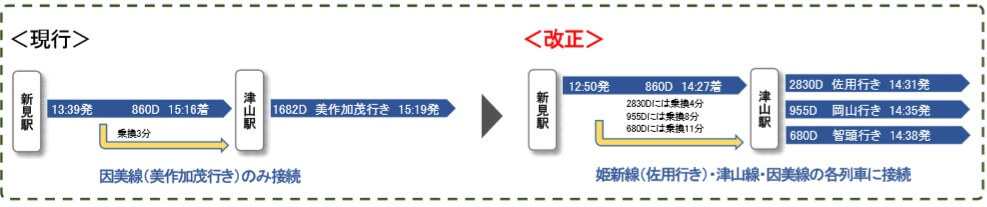 姫新線860D(新見発津山行き)の運転を約50分繰り上げることにより津山駅での接続体系を改善します。