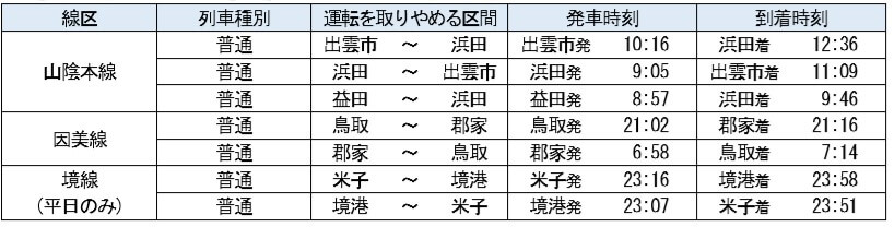 山陰線の快速の上り1列車(益田駅9:09発)について益田~浜田間を各駅停車とすること、米子~益田間の快速1往復(米子8:30発、益田7:45発)を各駅停車とすることにより、乗車機会を増やします。 この他、以下の列車の運行を取りやめます。