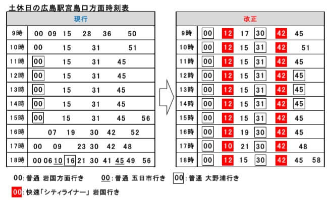 広島~岩国間では、広島駅を9時~18時台に発車する快速「シティライナー」を1時間あたり2本運転 します。普通列車と合わせると土休日のデータイムの運転本数は、1時間あたり4本から6本となります。