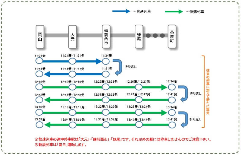 宇野みなと線の昼間時間帯において、岡山~備前西市間に普通列車を1往復、岡山~茶屋町間に快速列車を2往復、上下合わせて6本の列車を新設します。快速列車というと「マリンライナー」が30分おきに出ていますので、そちらとの誤乗に気を付けたいところですね。