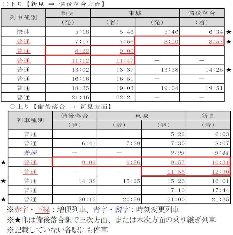 - 芸備線の新見~備後落合間において、4/4~7/31の間のみ試験的に列車を増発。