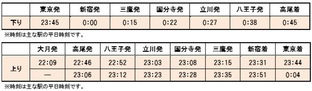 また、輸送体系の変更に伴い終電付近の運転時刻を繰り上げます。 特に、現在最も遅い終電として有名な列車の高尾駅到着が15分繰り上がりトップの座から陥落することとなり、ダイヤ改正以降は高崎線の終電(上野23:46→高崎1:37)がトップに立つことになります。