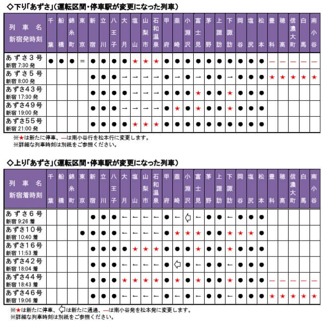今回のダイヤ改正で特急「あずさ」の一部列車において運転区間および停車駅を変更します。また、これに伴いあずさ3号が松本止まりに変更され、あずさ5号が南小谷行となります。