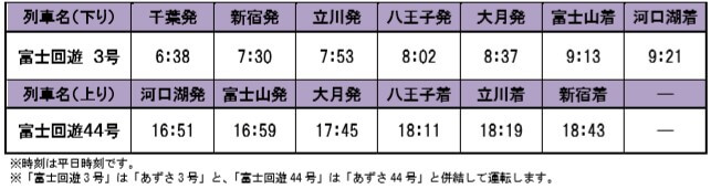 ちなみに、千葉駅発着の「富士回遊」の設定は初となります。 また、全ての特急「富士回遊」が富士急行線下吉田駅に停車します。