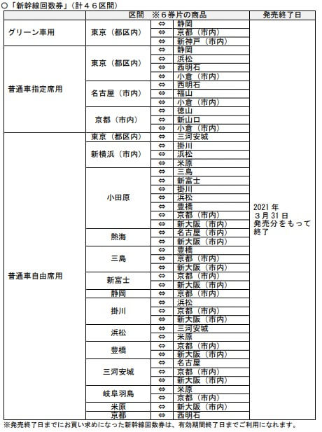 新幹線回数券は以下の区間について3月末を以て発売を終了します。