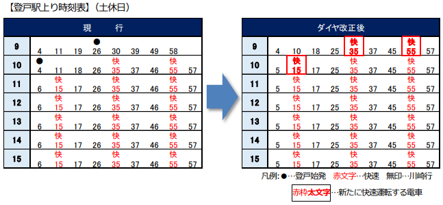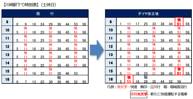 土休日で快速列車を運転する時間帯を拡大します。下り(立川方面)は9~16時台、上り(川崎方面)は9~15時台に快速列車を運転し、利便性を向上します。