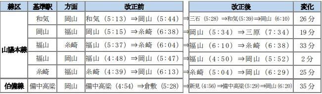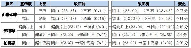 | 1950M | 岡山 | 6:38 | 西大寺 | 6:57 | 改正後は土曜・休日のみ運休 |