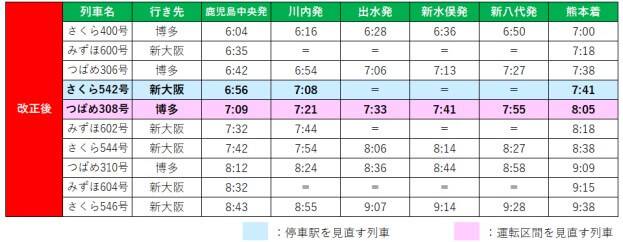 また、「みずほ」600号の運転時刻繰り上げに伴い熊本駅を始発とする「つばめ」308 号の運転区間を鹿児島中央駅始発に見直します。「さくら」542号の停車駅を見直し、速達性を向上させます。