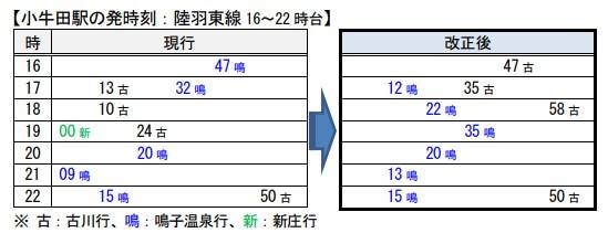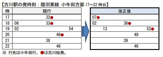 夕夜間を中心に行先などを変更し、古川~鳴子温泉間は運転間隔を概ね均等にします。また、古川駅での東北新幹線と陸羽東線の乗り換え時間を見直し、鳴子温泉方面への利便性を向上します。