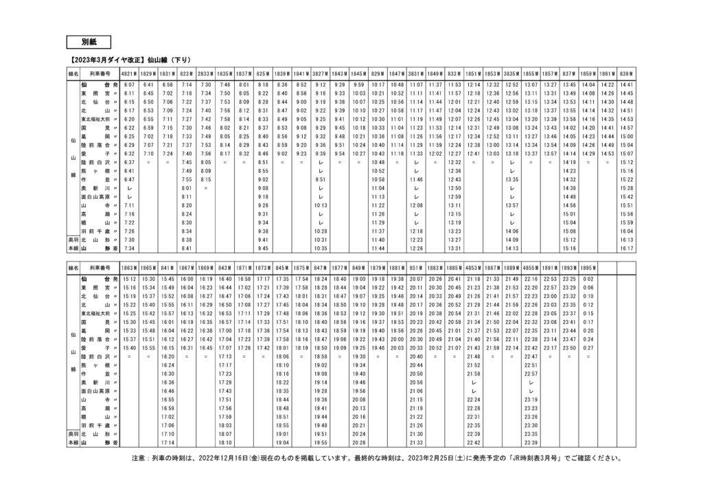- 仙台空港アクセス線の快速列車については運転時刻を見直します。ダイヤ改正後は仙台駅14:50発・仙台空港11:36発を快速列車として運転します。