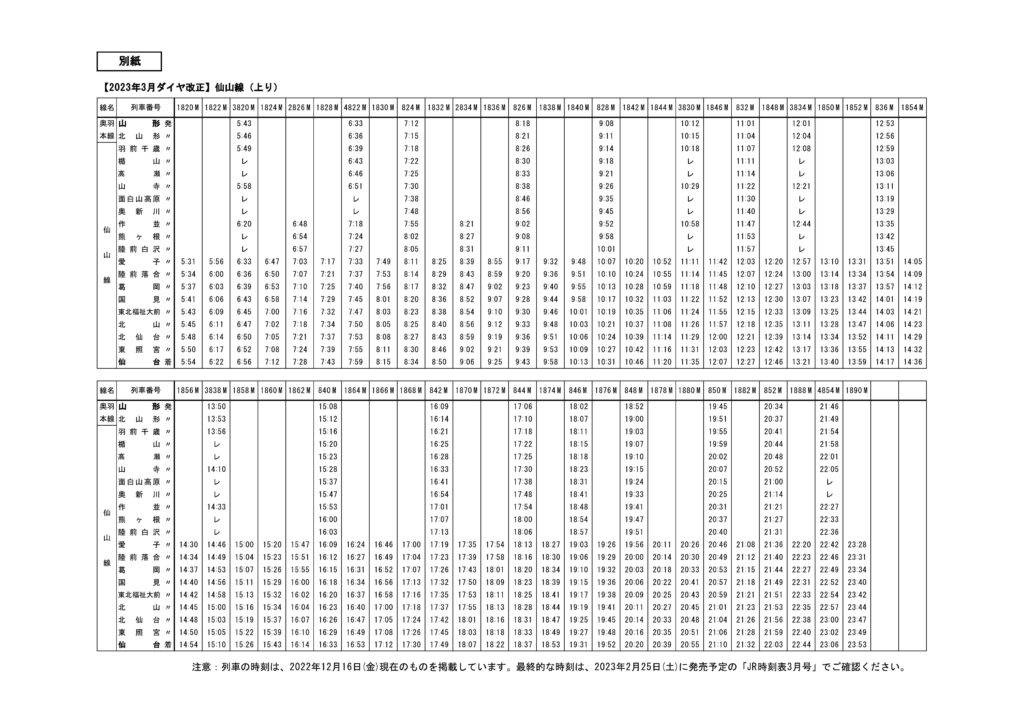 今回のダイヤ改正で快速の停車駅が統一され、仙台~愛子間は各駅停車となります。愛子~山形間は作並・山寺・羽前千歳・北山形に止まります。日中帯の愛子~山形間は普通列車と交互に運転する形とし、一部を普通列車に格下げします。これに伴い、ダイヤ改正後の快速列車の運転本数は7本となります。
