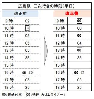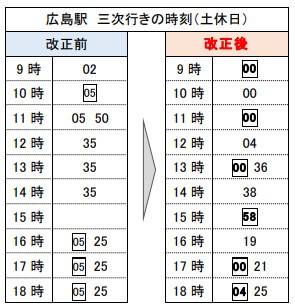 このほか、三次発広島行の最終列車を21:07発に繰り上げます。現行の最終列車は三次~狩留家間の運転を取りやめ、狩留家23:18発広島行として運転します。
