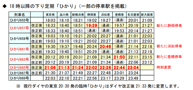 このほか、豊橋には東京 20:12 発の「ひかり」が新たに停車し、18 時以降に東京を発車し豊橋へ停車する「ひかり」の最大列車間隔を、2 時間 57 分から 1 時間 39 分に改善します。
