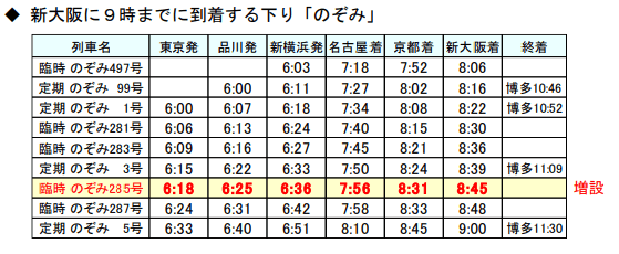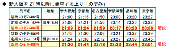 く見込まれる日に運転します。上り1本については、定期最終「のぞみ」の6分後の新大阪 21:30 発とします。