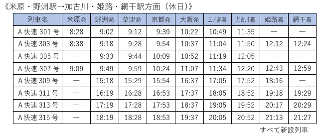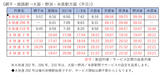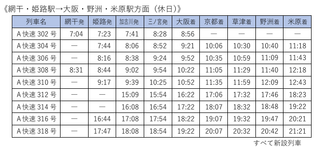 | 列車名 | 木津発 | 京田辺発 | 四条畷発 | 京橋着 | 北新地着 | 尼崎着 | 宝塚着 | 新三田着 |