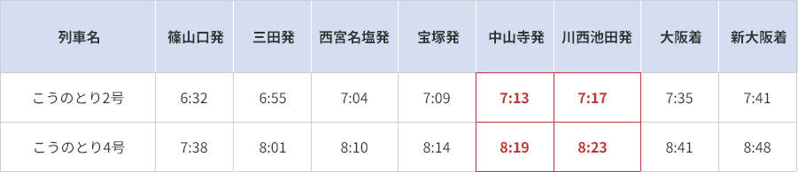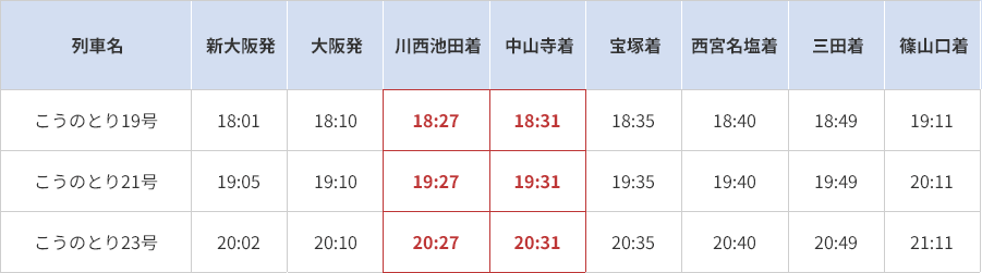 朝夕通勤時間帯の特急「こうのとり」が中山寺駅と川西池田駅に新たに停車します。また、平日の朝夕通勤時間帯に運転している通勤特急「らくラクやまと」が柏原駅と八尾駅に新たに停車します。
