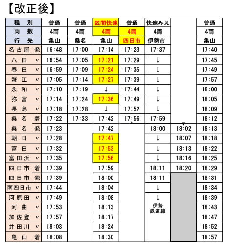 関西線では名古屋駅17:14発の快速亀山行きを区間快速として、ご利用の多い名古屋近郊の駅の停車回数を増やすとともに桑名駅~亀山駅間の運転間隔を調整します。これに伴い、名古屋駅17:23発の普通列車を四日市駅止まりとします。亀山駅では18:53発の普通鳥羽行きを13分繰り上げて18:40発とし、多気駅で新宮行き普通列車(多気駅19:34発)と接続を行います。