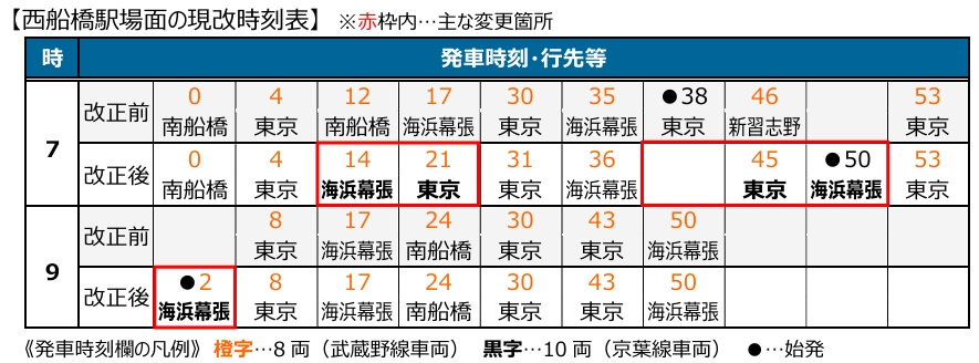 また、総武線各駅停車の西船橋駅から津田沼駅間で東京メトロ東西線直通電車の運転本数を見直します。