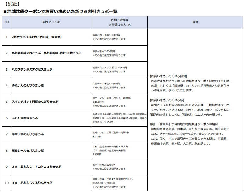なお、紙クーポンのみの取り扱いで、地域共通クーポン記載の「目的地の県」もしくは「隣接県」のエリア内相互発着となる割引きっぷのみ発売します。