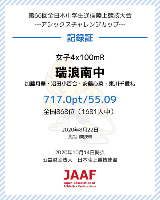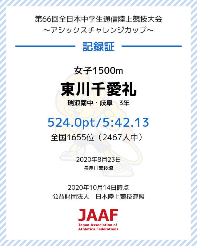 また、中学時代は陸上部だったのか瑞浪市が主催するマラソン大会に出場しそこそこ好成績を修めていた他、第64回全日本中学校通信陸上競技岐阜県大会の1500mタイムレースなどにも出場していました。