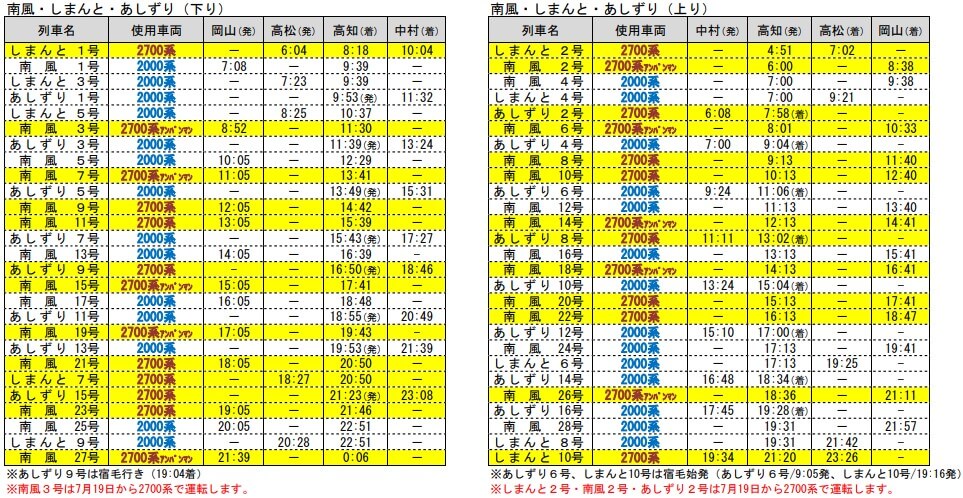 この他にも2700系が投入され、一部の2000系を置き換えます。時刻は以下の通りです。