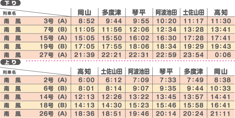 新しい「アンパンマン列車」は2編成が岡山~高知間の「南風」で運用されます。時刻は以下の通りです。
