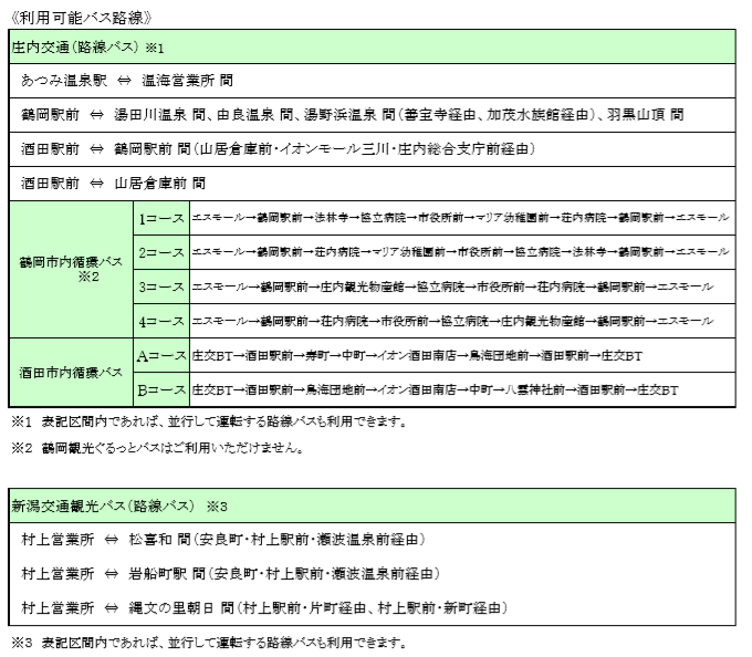 - フリーエリア内のJR線及び由利高原鉄道線の普通列車(快速含む)の普通車自由席、庄内交通バス、新潟交通観光バスが2日間乗り降り自由です。特急や指定席等を利用する場合は、別に特急券や指定席券等が必要です。