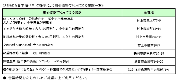 なお、 「きらきら日本海パス」をご提示いただくと、エリア内の一部施設が割引でご利用になれます。 割引の適用施設は以下の通りです。