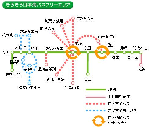 日本海きらきら羽越観光圏(秋田県にかほ市、山形県鶴岡市・酒田市・戸沢村・三川町・庄内町・遊佐町、新潟県村上市・関川村・粟島浦村)を中心とするフリーエリア内のJR線及び由利高原鉄道線の普通列車(快速含む)普通車自由席、庄内交通バス、新潟交通観光バスが2日間乗り降り自由です。観光圏内に点在する観光地や温泉地までのアクセスにご利用いただけます。 フリーエリアは以下の通りです。