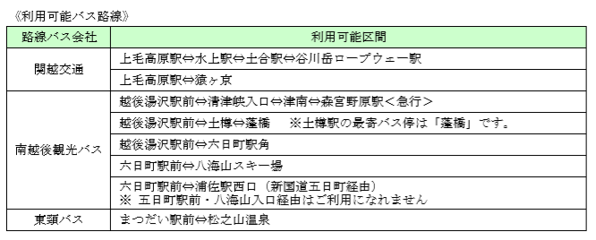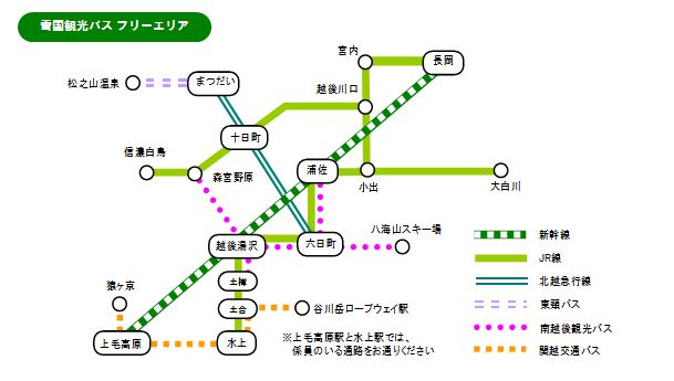 - フリーエリア内のJR線および北越急行線の普通・快速列車の普通車自由席、関越交通バス、南越後観光バス、東頸バスが2日間乗り降り自由です。特急(新幹線含む)や指定席等を利用する場合は、別に特急券や指定席券等が必要です。